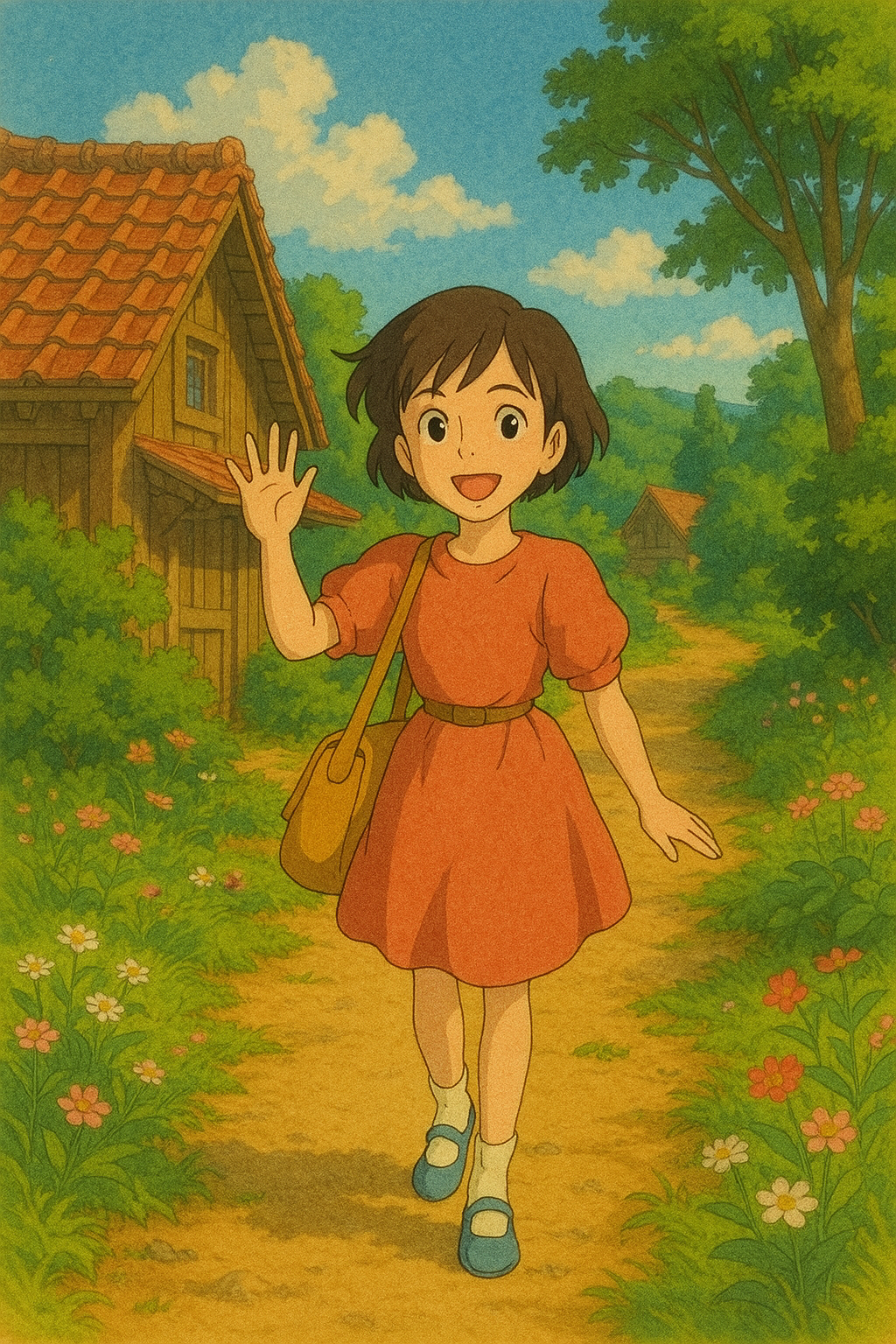 - "초여름 들판을 걷는 소녀를 지브리 풍으로 그려줘!"