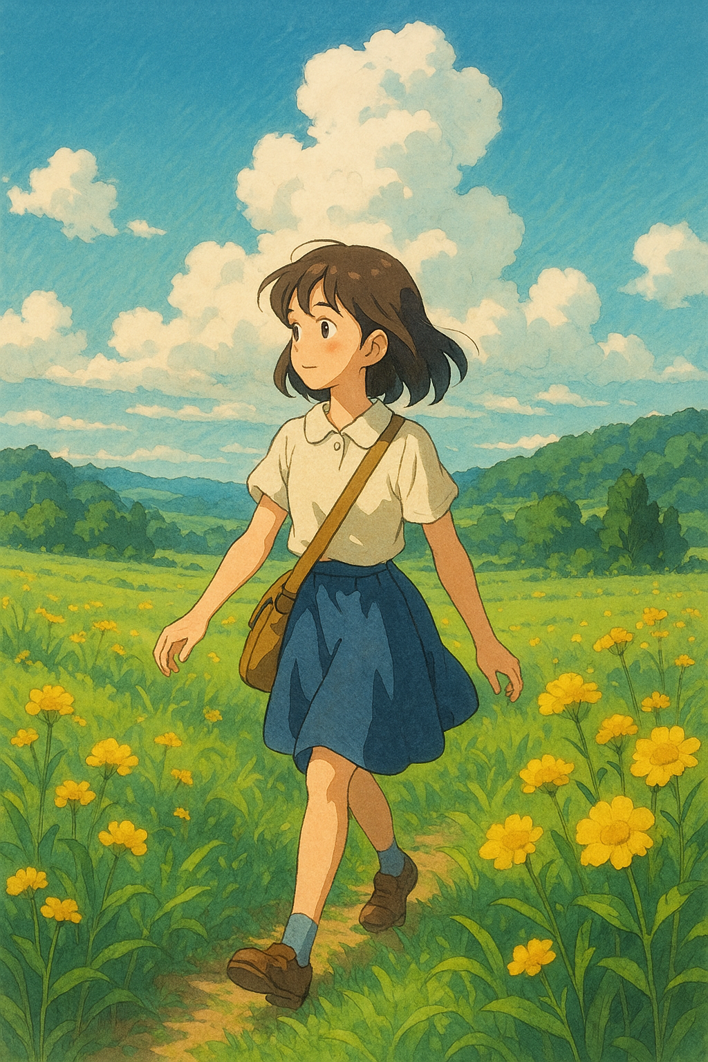 "초여름의 들판을 걷는 소녀, 따뜻한 햇살이 가득한 지브리 스타일로 그려줘."